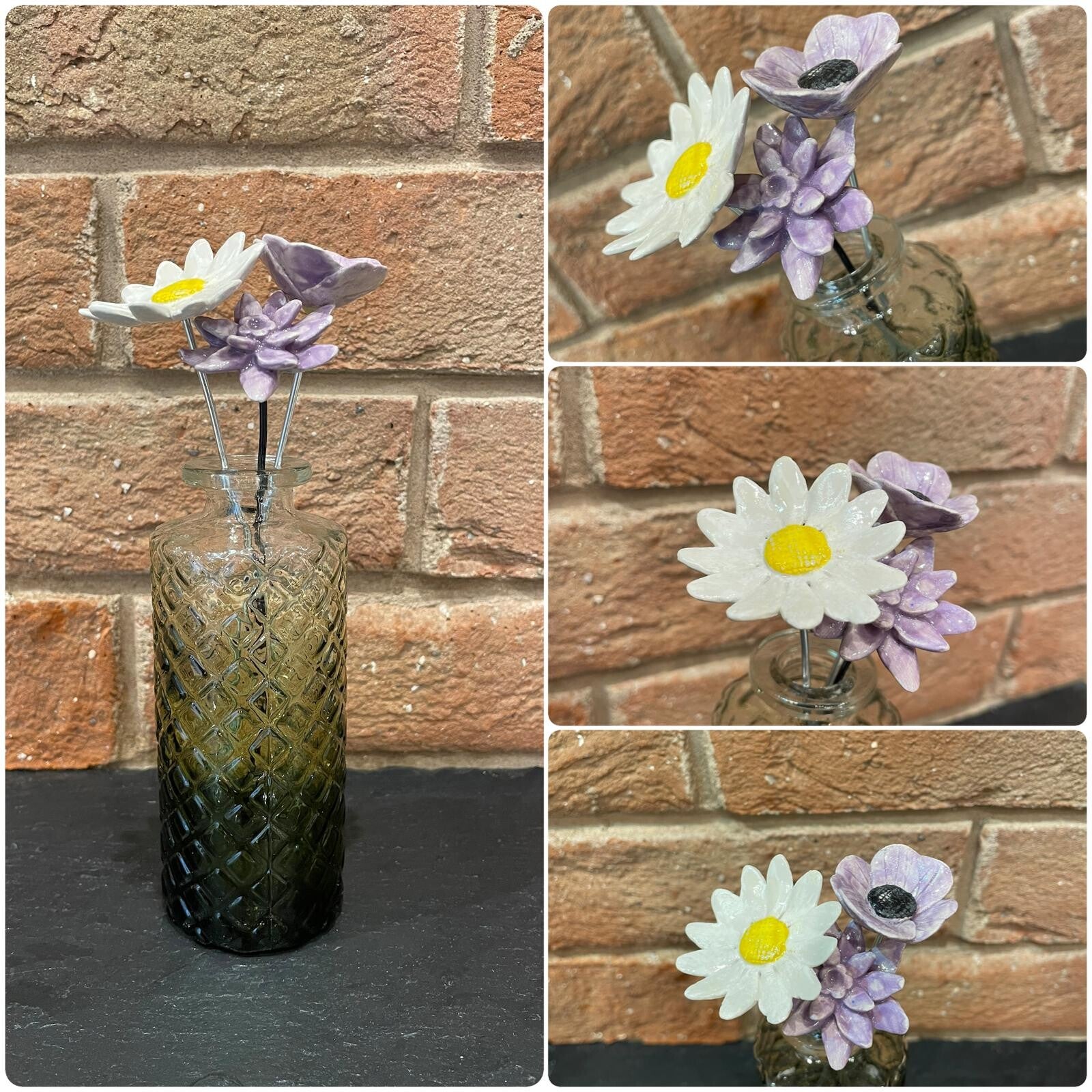 Beautifully delicate ceramic bouquet of three flowers. Approximately 19cm tall. Three small ceramic glazed flowers on aluminium wire stems in a glass vase.