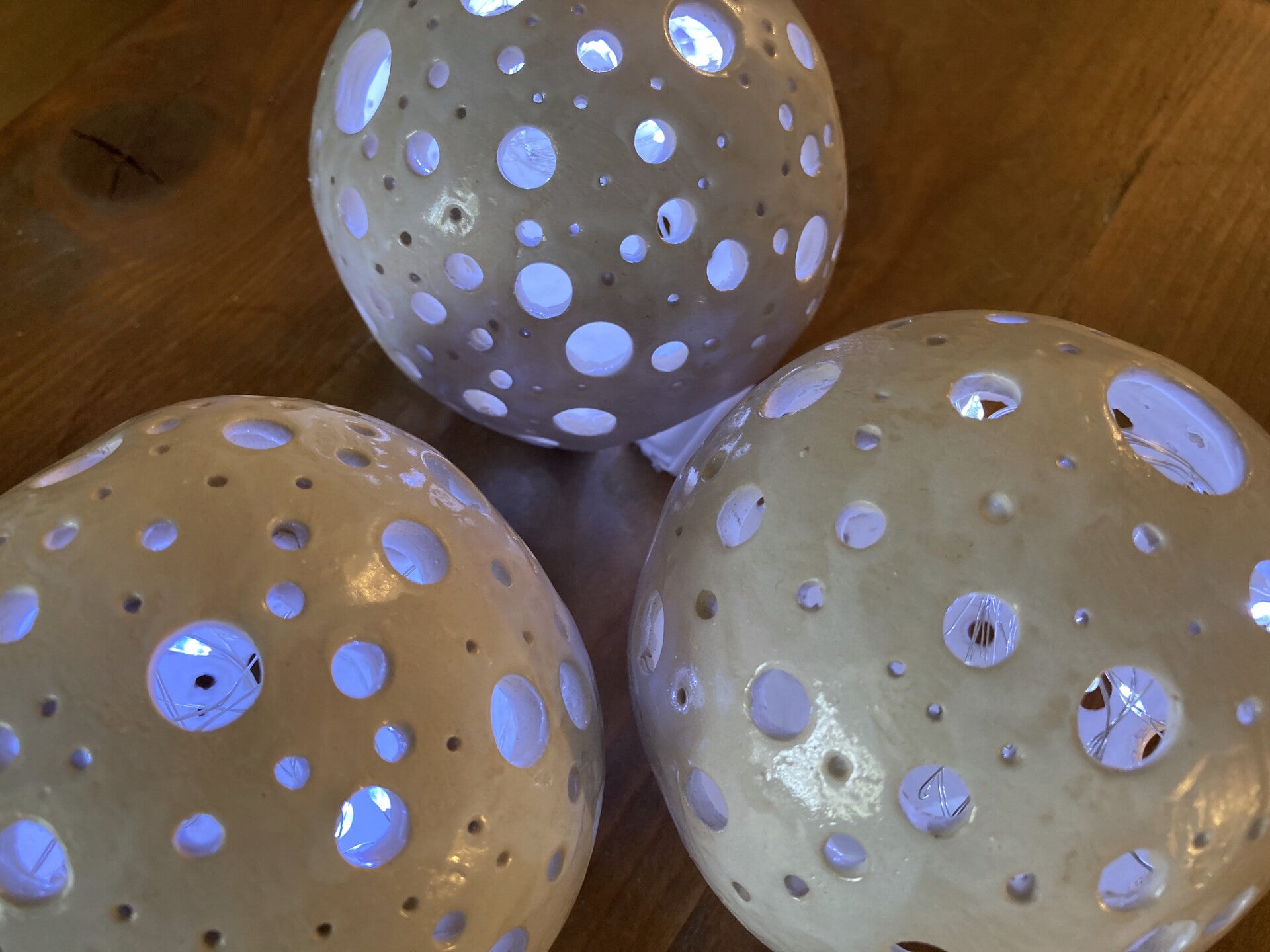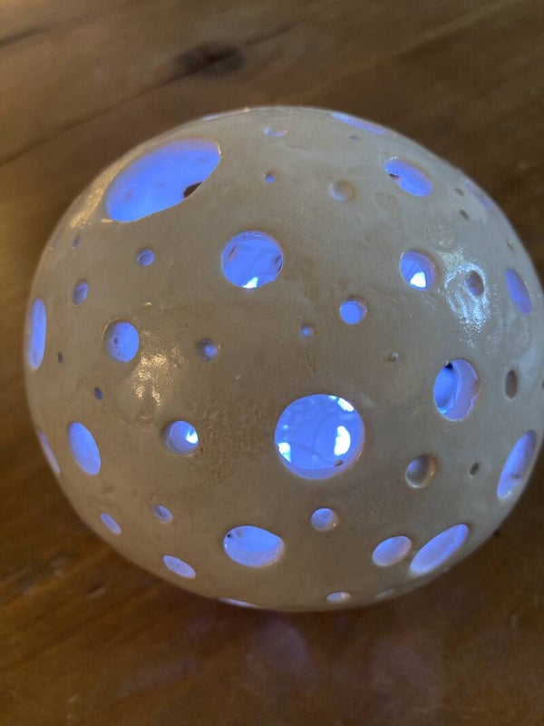 Handmade spherical moonlight with battery powered LED lights finished White crawl glaze and sold with additional LED light unit. Each moonlight is unique, no two are the same.