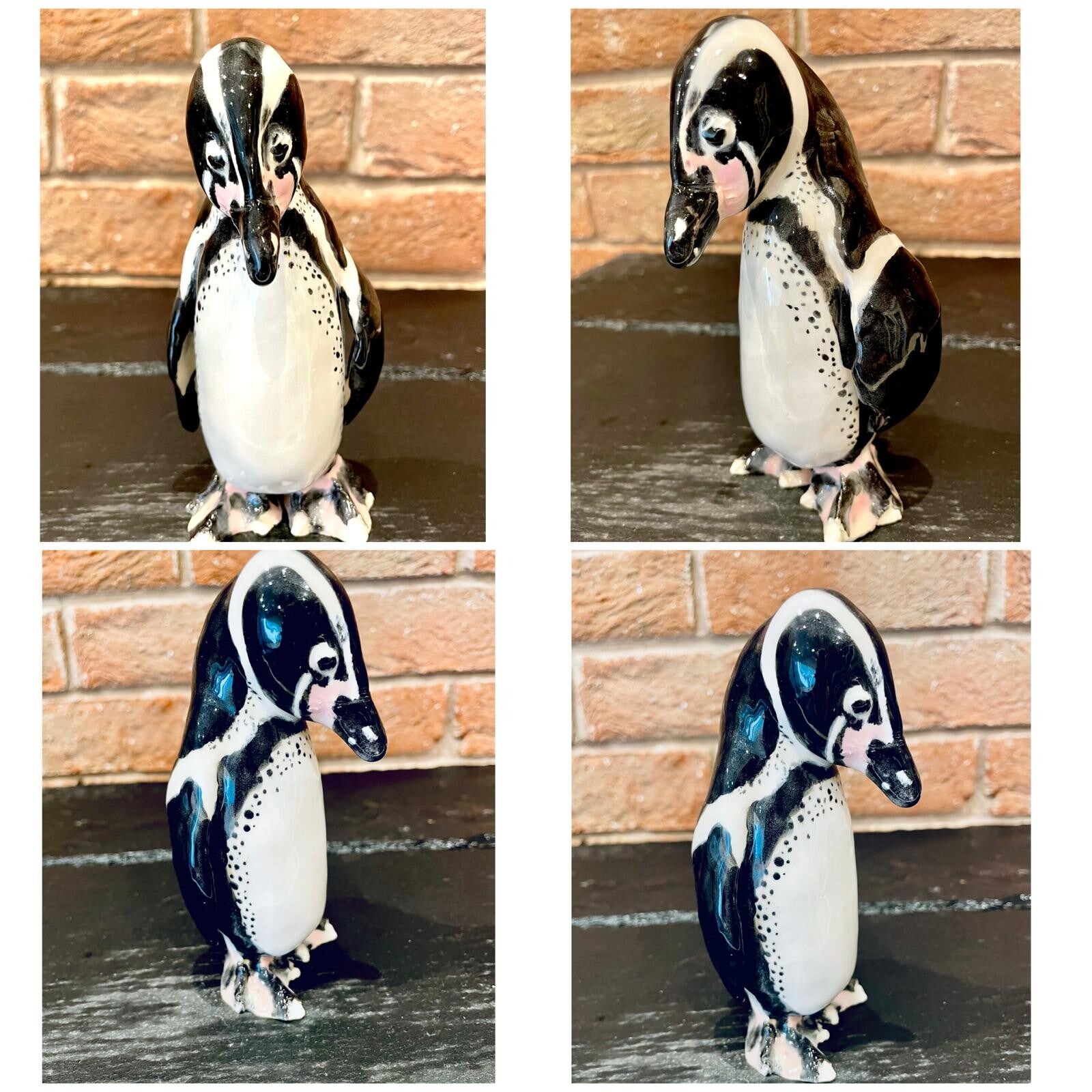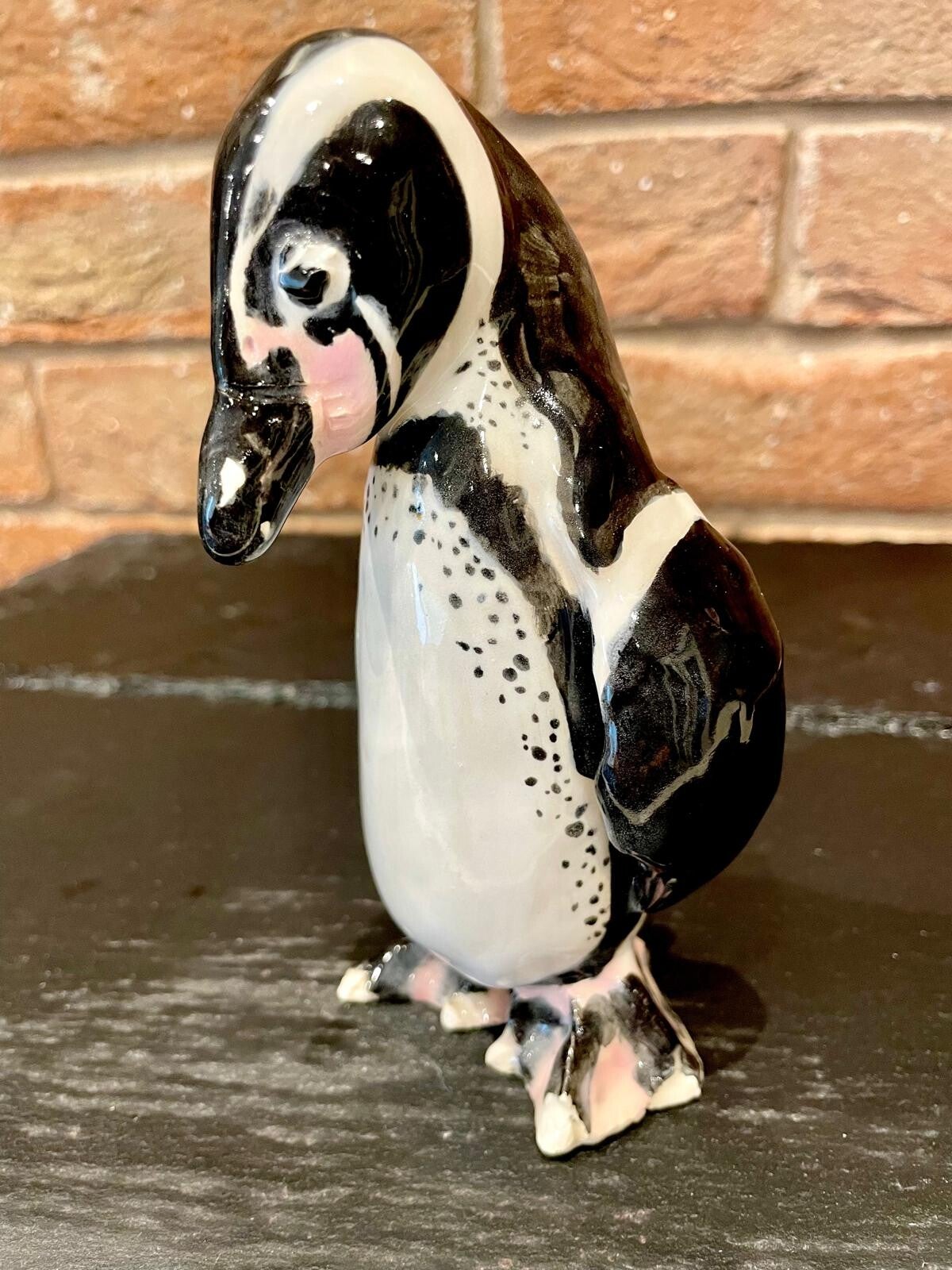 A handmade figurine of a Humboldt Penguin, modelled on one of the penguins in captivity within the penguin enclosure at Folly Farm in Pembrokeshire. This figurine stands approximately 13cm tall, coated in a clear gloss glaze with handpainted markings.