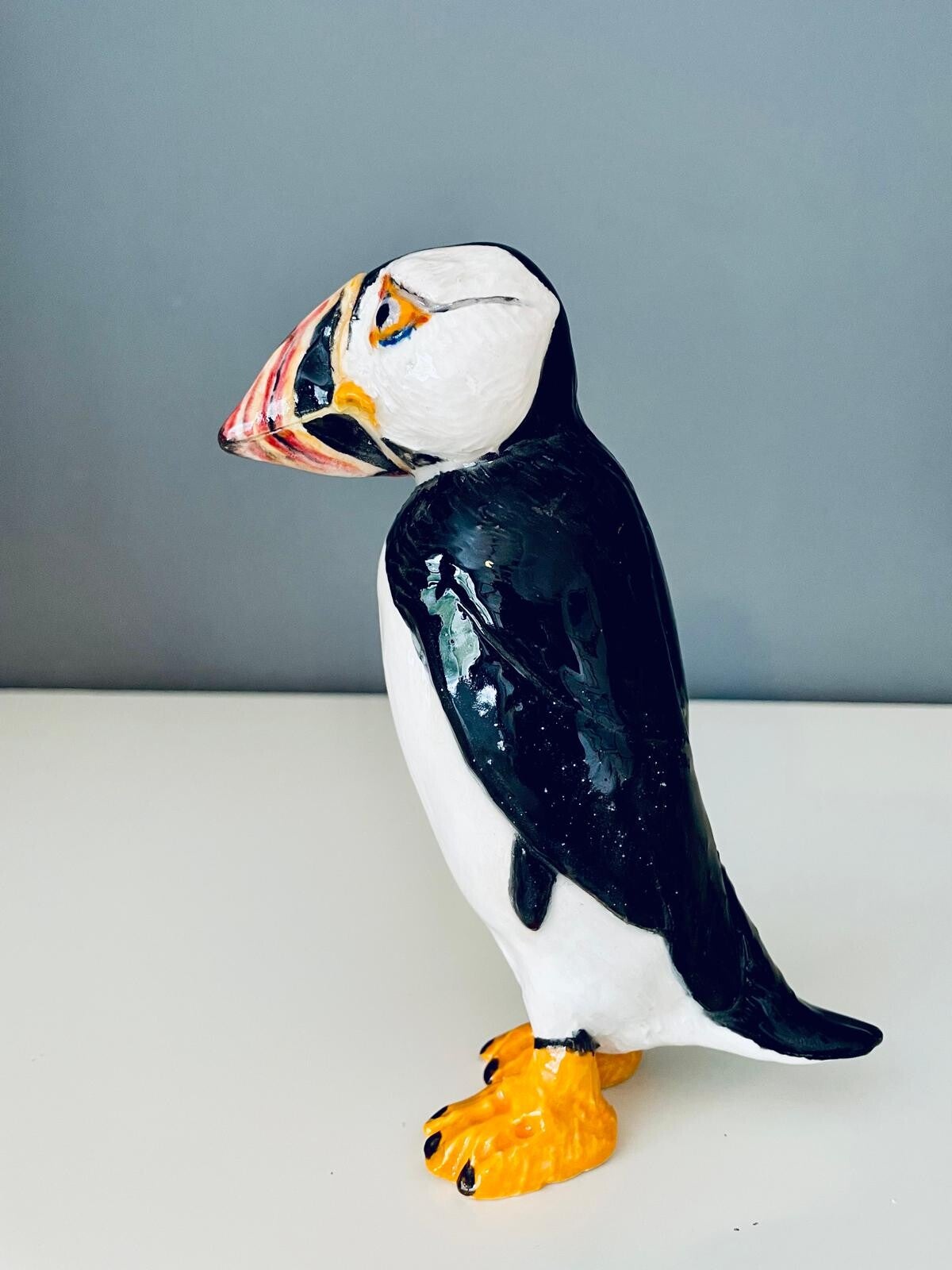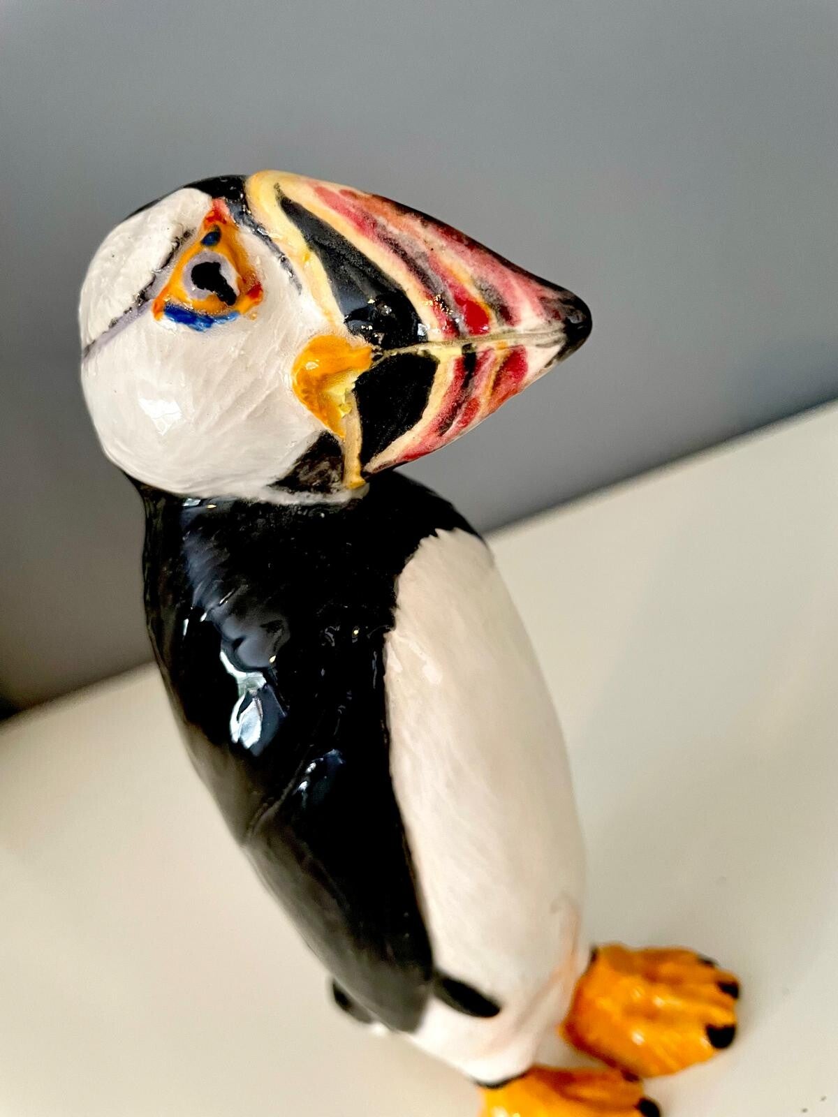 A freestanding figurine handsculpted in earthenware clay, handpainted and clear glazed, standing approximately 15cm tall. Inspired by the Puffins around the Pembrokeshire coast.