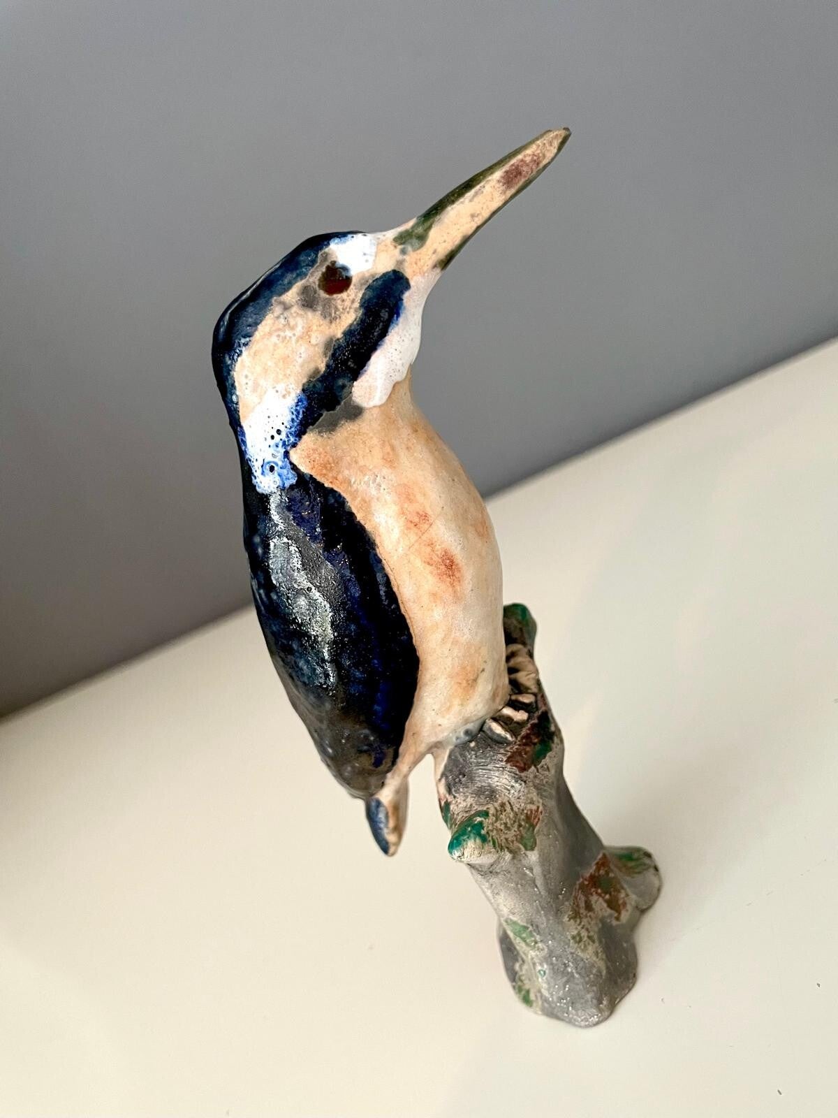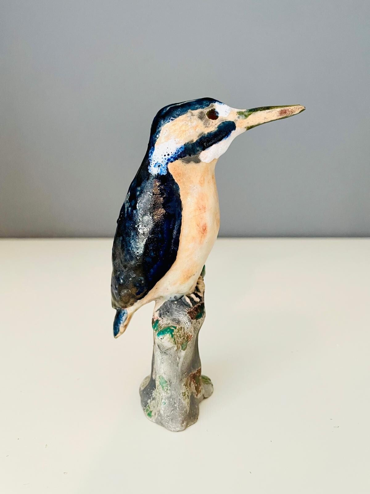Raku Kingfisher perched on a tree stump. Made from stoneware clay, modelled and decorated in my own Raku glazes and fired in a Raku kiln with post firing reduction to get the effects on the glaze and bare clay. Standing approximately 15cm tall.